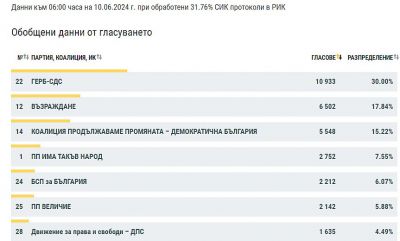 Резултатите към 6:00 сутринта при обработени 36.73% протоколи от секционните избирателни комисии ГЕРБ печели доверието на 23,39% от избирателите.