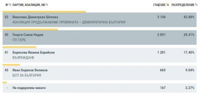 Опцията "Не подкрепям никого" са избрали 167 гласоподаватели (2,27%).