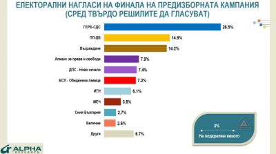 Очаква се парламентът да бъде съставен от 7 партии, като има шанс и осма партия да премине изборния праг. ГЕРБ-СДС водят с нарастваща подкрепа, следвани от ПП-ДБ, „Възраждане“, двете фракции на ДПС, а накрая – БСП и ИТН. Това показват данните от изследване на "Алфа Рисърч", реализирано със собствени средства на агенцията в периода 20-23 октомври 2024 г.