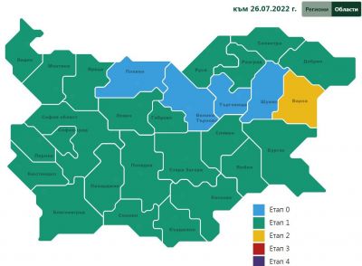 От справка в новата карта се вижда, че Варна е в жълтия Етап 2, а почти всички области са в Етап 1. Плевен, Велико Търново, Търговище и Шумен все още са в Етап 0.