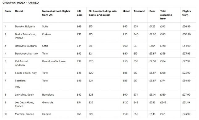 Банско оглавява класацията. Курортът предлага широка мрежа от писти, красива планинска природа и автентичен стар град, защитен от ЮНЕСКО. Скиорите могат да наемат обувки за ски за 15 паунда на ден, а бирата струва само 1 паунд, което прави курорта достъпен и за кратки почивки, се изтъква в класацията.