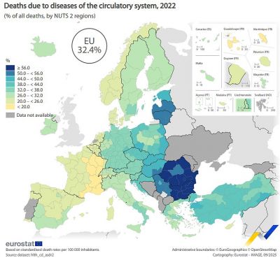 Болестите на кръвоносната система – включително инфаркти, сърдечни заболявания, хипертонични заболявания и заболявания на белодробното кръвообращение – са били водеща причина за смърт в Европейския съюз през 2022 г., сочат данни на Евростат.