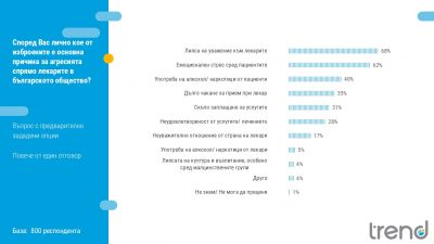 Участниците в проучването посочват като водещи причини за проявите на агресия от страна на пациентите: липсата на уважение към лекарското съсловие (68%), емоционалния стрес сред самите пациенти (62%) и употребата на алкохол или наркотици (40%).