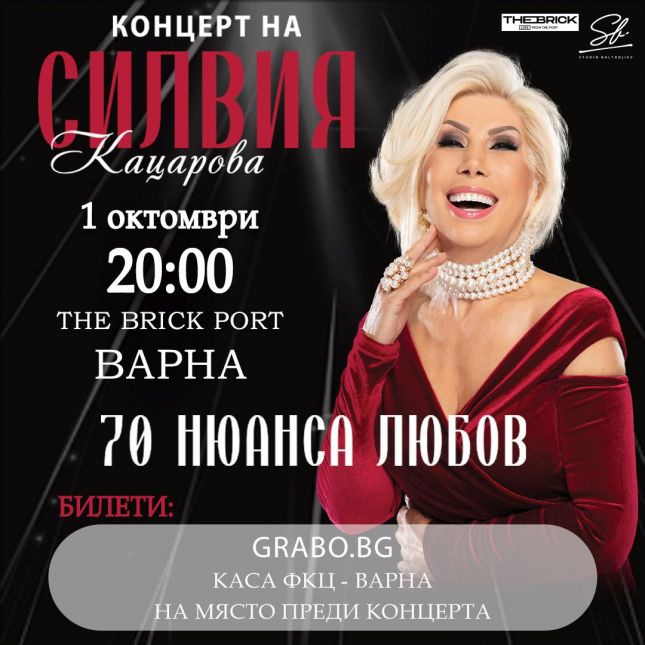Една от най-обичаните дами на българската естрада – Силвия Кацарова, празнува своя 70-годишен юбилей и 50 години на сцената с вълнуващ концерт в морската столица. На 1 октомври в Клуб „The Brick Port“...