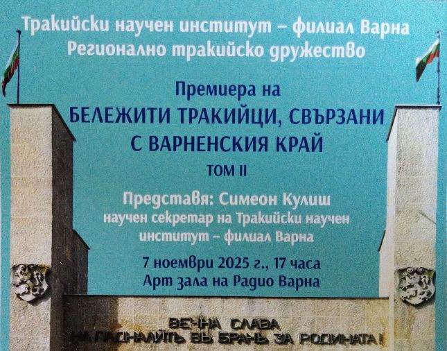 На 7 октомври от 17:00 ч. в Арт салона на Радио Варна ще се състои представянето на втория том от историческия сборник „Бележити тракийци, свързани с Варненския край“. Изданието е дело на Тракийския научен...