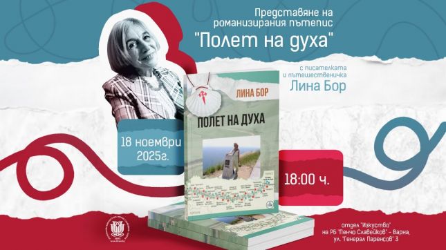 От 18 часа днес, 18 ноември 2025 г., в Отдел „Изкуство“ на Регионална библиотека „Пенчо Славейков“ във Варна ще бъде представен пътеписът „Полетът на духа“ от Лина Бор – псевдоним на варненската авторка Веселина Табакова.