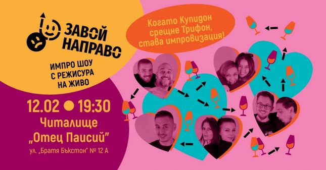 От 19:30 часа тази вечер, 12 февруари, варненци ще имат възможността да гледат импро шоуто „Завой Направо“. Събитието, посветено на празниците Св. Валентин и Трифон Зарезан, ще се проведе в Народно читалище „Отец Паисий“ (Маяковски) във Варна.