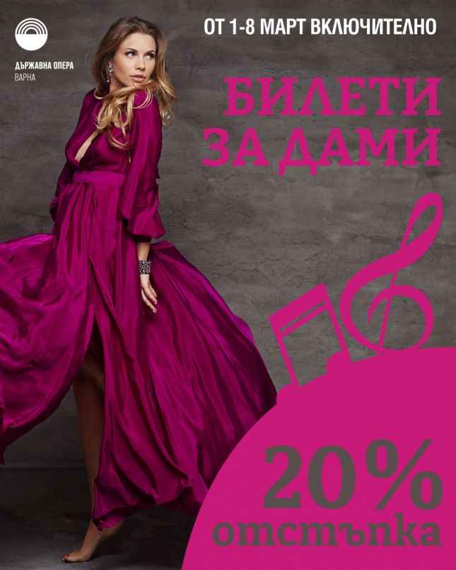 По случай Международния ден на жената Държавна опера Варна и Драматичен театър „Стоян Бъчваров“ подготвиха специален празничен жест към дамите. От 1 до 8 март включително билетите за спектаклите от мартенската им програма ще се предлагат с 20% отстъпка, съобщават от Театрално-музикален продуцентски център (ТМПЦ) - Варна.