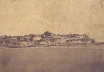 Панорамна фотография на Братя Папазян на града откъм морето. Папазян създават през 1874 г. клон на цариградското си ателие във Варна. На снимката вдясно е нос Варна, на чието място днес е вълнолома на варненското пристанище. Виждат се крепостната стена, малкият фар на нос Варна и каменните сгради по крайбрежната улица.