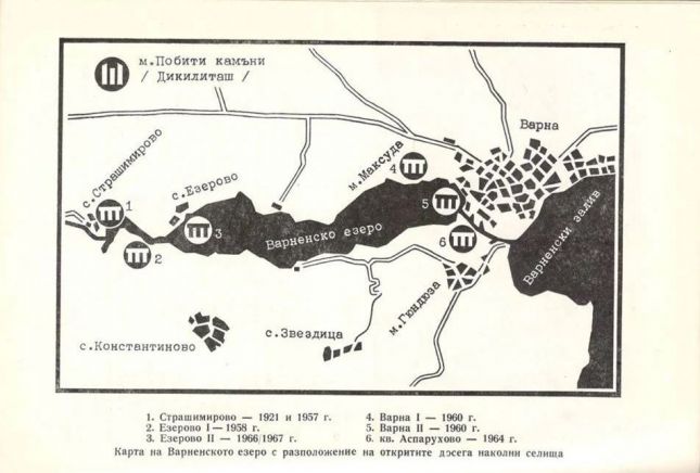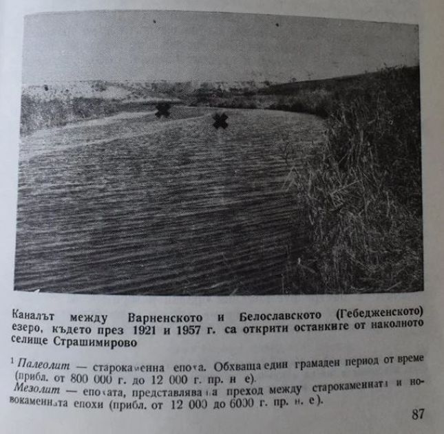 „При прокопаването отсам железопътния мост край с. Голям Аладън (Страшимирово) е направено паметно откритие на наколни постройки, обитавани преди няколко хиляди години от едно първобитно рибарско население, което си правело жилища, за по-голяма сигурност, върху колове над водата. Коловете на постройките са закрепени в долния си край в пласт с морски миди, каквито се срещат в Черно море. Това показва, че нашето езеро е било морски залив, когато нямало още преградата между езерото и морето (до гр. Варна). Според нашите изчисления, за които говорим на друго място, преградата почнала да се образува преди около 3000 години, следователно откритите наколни постройки са по-стари.“, пишат за откритието братя Шкорпил.