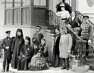 Княз Фердинанд I, Доростоло-Червенският митрополит Григорий (седнал), архимандрит Василий (бъдещ митрополит, възпитател на княз Борис), Княгинята-майка Клементина Орлеанска и други в дома на дипломата Димитър Станчов (прав в центъра). Горе на стълбите – придворната дама Анна дьо Грено, до нея Граф Робер дьо Бурбулон – личният секретар на княза, Свищов, 1890 г.