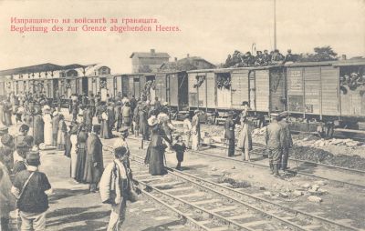Влакова композиция със заминаващите войски и изпращачи на перона по време на Първата световна война.