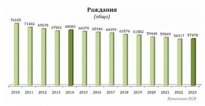 Общата тенденция у нас след 2009 г., когато се раждат рекордните над 80 хил. бебета, е всяка година да се раждат с около 2 хил. деца по-малко в сравнение с предходната година. Тази тенденция е нарушена, макар и слабо, на два пъти– през 2014 г. и през изминалата 2023 г. Все пак през миналата година са родени с около 10 хил. бебета по-малко в сравнение с 2014 г., макар и да са малко повече в сравнение с 2022 г.