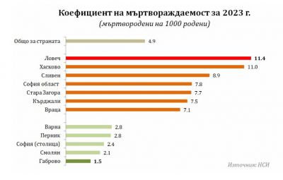 Докладът очертава и сериозни разлики в показателите за мъртвородени и детска смъртност между градовете и селата. Например, в Ловеч и Хасково този коефициент е над 10 на 1000 бебета – стойности, сравними с тези в някои африкански страни. В България едва няколко града поддържат коефициент под 3, което е в съответствие с европейските норми. През 2023 г. сред тях са Габрово, Смолян, София, Перник и Варна, което подчертава нуждата от по-ефективни мерки в по-малките населени места за подобряване на грижата за новородените.