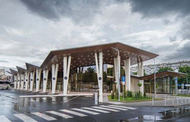 Акцентът е покритата външна чакалня, която е достатъчно широка, за да осигури движение и в двете посоки и е ориентирана така, че да има директна видимост още от улицата и пътниците бързо и лесно да се ориентират до стоянката на автобуса. Покривът ѝ е достатъчно висок, за да може под него да паркира автобус, така че входът му да бъде защитен при лошо време. Осигурява безопасност на пътниците по всяко време на денонощието. Няма тъмни, отделени и скрити от погледа пространства. Голямата височина на козирката на външния перон, както и богатото остъкление на вътрешните части на сградата позволяват всички пространства през които преминават пътниците да се обхванат с един поглед. Освен със закрита и открита чакалня, автогарата разполага и с лекарски кабинет, стая за майки с деца, търговски център и кафене, които имат възможност за собствен достъп, както и офиси за превозвачи, непосредствено пред стоянките на автобусите. Конструкцията е смесена със стоманобетонни колони и козирка от метал, чиято форма е подходяща за монтиране на слънчеви панели.