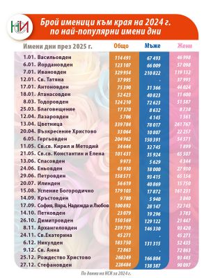 Над 3 млн. българи ще празнуват имен ден на основните християнски празници през 2024 г. Най-много - 339 784, ще почетат името си на Цветница (13 април 2025 г.). Общо 329 954 българи ще празнуват на Ивановден, а на Архангеловден – 239 750 именици.