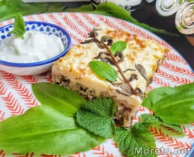 4. Приготвяне на заливката: Разбийте добре яйцата, брашното, киселото мляко, прясното мляко и солта. Залейте с този смесен сос плънката.