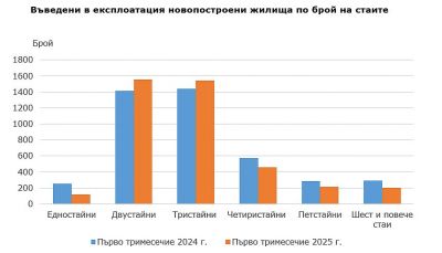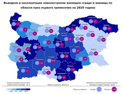 За страната въведените в експлоатация жилищни сгради през първото тримесечие на 2025 г. е 1 052, а новопостроените жилища в тях са 4 086.