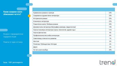 Най-предпочитаните литературни жанрове са криминалните романи и трилъри (24%), съвременната художествена литература (23%), историческите романи (22%), класическата литература (22%) и любовните романи (20%).