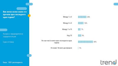 В същото време 43% от анкетираните признават, че през последната година не са прочели нито една книга.