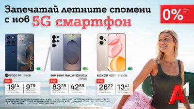 През юли А1 предлага на своите клиенти селекция 5G смартфони, достъпни при изгодни условия – с 0% лихва на лизинг за 24 месеца в комбинация с план Unlimited. В кампанията са включени модели от водещи производители, които съчетават модерен дизайн, производителност и иновативни технологии и идват в комплект с практични аксесоари. Така потребителите могат да направят смарт инвестиция в ново устройство именно в сезона, в който свързаността и улавянето на специалните моменти играят ключова роля за пълноценното лятно преживяване.
