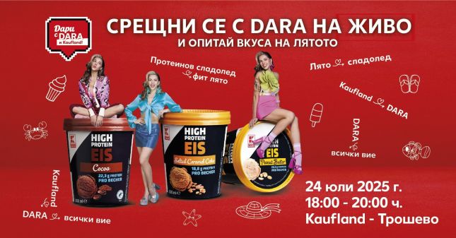 Летните емоции във Варна ще станат още по-сладки на 24 юли, когато поп идолът DARA ще се срещне лично с феновете си в хипермаркета на Kaufland в кв. „Трошево“. Срещата ще започне в 18:00 ч. и ще продължи до 20:00 ч., като всеки почитател ще има възможност за снимка, автограф и кратък личен момент с изпълнителката. По време на срещата петима ще могат да спечелят и двойни билети за концерта на изпълнителката във Варна на 20 август.
