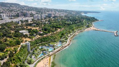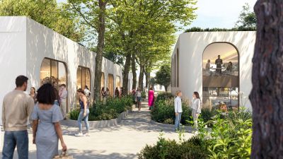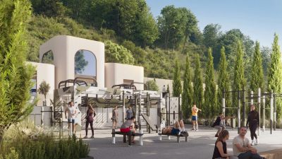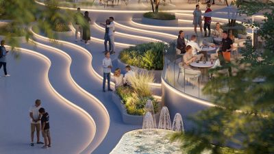 В проекта са включени вътрешни алеи с пейки и дървета, пространства с водни огледала и фонтани, детски площадки, игрища за волейбол и падел, както и открити фитнес зони.