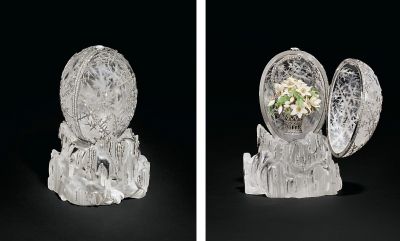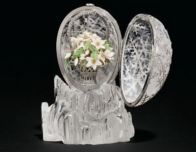 Блестящите кристалчета скреж върху стъклената повърхност на яйцето изглеждат толкова реалистични, че почти очакваш допирът им да бъде леден. То е поставено върху нещо, напомнящо парче лед – почти безформено, сякаш току-що извадено от замръзналата Нева, но въпреки това го държи нежно и сигурно. По този своеобразен леден сталагмит се стичат тънки сребристи струйки, сякаш всеки момент предстои размразяване.