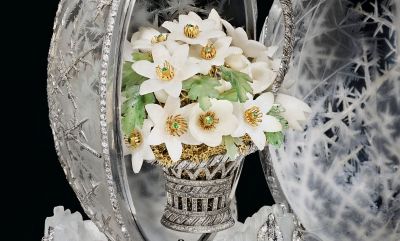 Под замръзналите форми, които покриват прозрачната черупка, прозира намек за бяло. Яйцето се разтваря като медальон и разкрива тайната си: висяща кошничка, пълна с горски анемони. Първите цветя, които се появяват, когато снегът започне да се топи – знак, че дългата и сурова руска зима е към своя край, а пролетта е на прага.