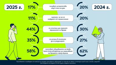 Дигиталните ни навици се променят, а стремежът към по-здравословен баланс между онлайн и офлайн живот се засилва. Макар употребата на мобилни устройства да остава висока, особено сред най-младите, значително повече хора целенасочено се опитват да ограничат времето си пред екрана – близо 45% през 2025 г. срещу 30% през 2024. Добрата новина е, че успеваемостта на тези усилия вече е значително по-голяма – 35% през 2025 г. и 27% година по-рано. А най-силният мотивиращ фактор за това да оставят телефона си и тази година е комуникацията на живо, като около 60% от анкетираните посочват именно този отговор.
