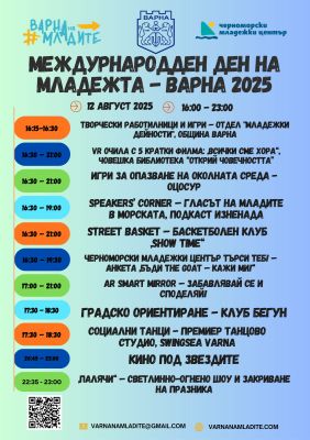 Община Варна организира разнообразни инициативи по повод Международния ден на младежта - 12 август. В същия ден от 16:00 до 23:00 часа на пл. „Антон Новак“ на входа на Морската градина и пространството...