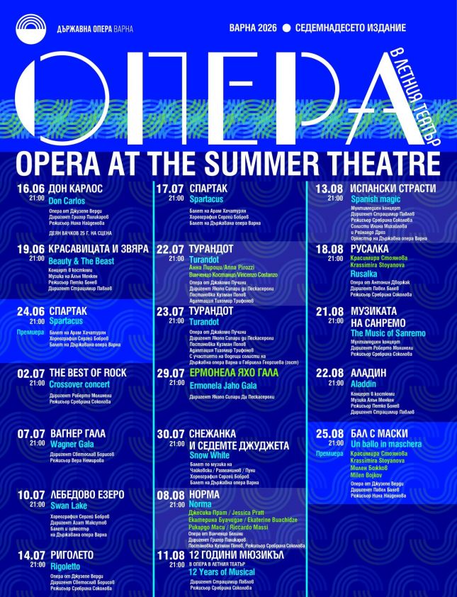 Държавна опера Варна обяви програмата за фестивала Опера в Летния театър 2026 и стартира кампанията за продажба на билети със специално намаление от 30% за всички спектакли. Фестивалът ще се проведе за 17-та поредна година, началото му е на 16 юни, а финалът е предвиден за 25 август.