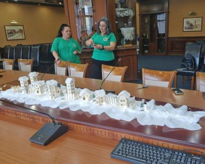 Заседателната маса бе преобразена от сръчните ръце на дамите от екипа на детското заведение в коледно градче – с малки и големи сгради със заснежени покриви и светещи прозорчета, пейки и беседки, централен площад, изпълнен с коледари, часовникова кула, висока сграда и мост – препратка към сградата на Общината и Аспарухов мост.