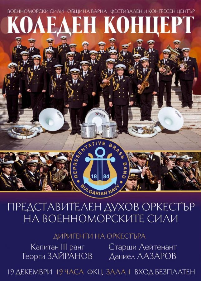 Представителният духов оркестър на ВМС ще изнесе празничен концерт във Варна от 19 часа тази вечер, 19 декември, във Фестивалния и конгресен център. Диригенти на оркестъра ще са кап. III ранг Георги...