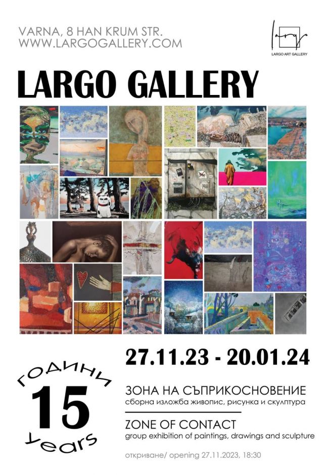 От 18:30 часа днес, 27 ноември 2023 година с откриването на голяма сборна изложба галерия Ларго ще отпразнува 15 години от създаването си. Експозицията е под мотото „Зона на съприкосновение“, защото основната мисия и смисъл на съществуването на галерията е именно в това – да бъде мястото, където художниците и техните творби да могат да достигнат до сърцата, умовете и очите на ценителите, на хората, изпитващи необходимост от непрекъснат досег с изкуството.