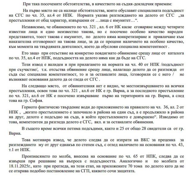 В мотивите си съдът посочва, че и петимата подсъдими, както и 25 от общо 28 свидетели, са от Варна. Това обстоятелство обуславя извода, че делото следва да бъде изпратено във ВКС, за да бъде определено дали да се гледа от друг компетентен съд.