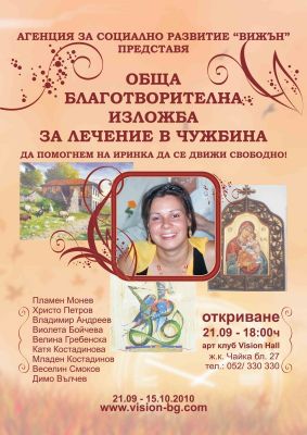 Картини на изявени варненски художници ще бъдат представени в обща благотворителна изложба под надслов: „Да помогнем на Иринка да се движи свободно”. Събитието е организирано от Агенция за социално развитие – ВИЖЪН, а откриването е на 21 септември 2010 г. от 18:00 ч. в Арт клуб VISION HALL, гр. Варна, кв. „Чайка”, бл. 27. Средствата събрани от изложбата ще бъдат предоставени за лечението на Иринка, което е нужно да се извърши в Израел.