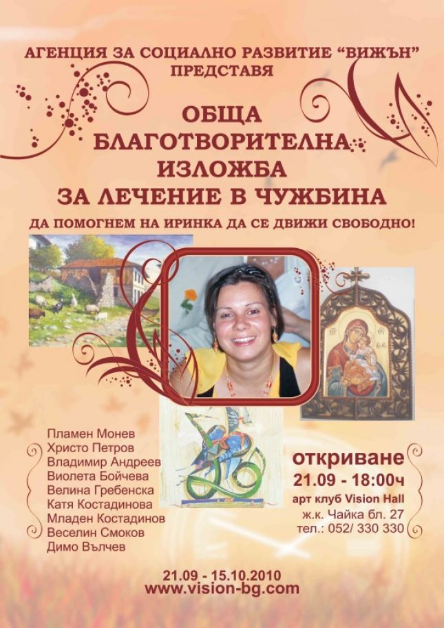 Картини на изявени варненски художници ще бъдат представени в обща благотворителна изложба под надслов: „Да помогнем на Иринка да се движи свободно”. Събитието е организирано от Агенция за социално развитие – ВИЖЪН, а откриването е на 21 септември 2010 г. от 18:00 ч. в Арт клуб VISION HALL, гр. Варна, кв. „Чайка”, бл. 27. Средствата събрани от изложбата ще бъдат предоставени за лечението на Иринка, което е нужно да се извърши в Израел.