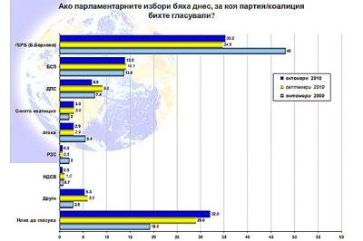 Ако изборите са днес, около 35% от българите ще гласуват за ГЕРБ, за БСП - под 14%, а за ДПС - 6,8%. Това показва национално представително изследване на „Галъп интернешънъл" (Gallup International) за политическия и икономическия индекс. Динамиката в рейтинга на Бойко Борисов се доближава до динамиката в рейтинга на Иван Костов като премиери за първите 15 месеца от управлението на правителствата им. Изследването е направено в периода 30 септември - 7 октомври 2010 г. сред 1010 души на възраст над 18 години чрез лични стандартни интервюта.