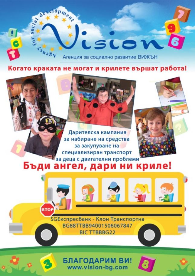 На Международния ден на хората с увреждания, с детска изложба на децата от Детски център „Вижън Джуниър”, участващи в художествените курсове към Агенцията за социално развитие „Вижън”, продължава благотворителната инициатива за набирането на средства за специализиран транспорт за децата с двигателни проблеми, учащи в общообразователните училища във Варна и на които Агенция „Вижън” предоставя услугата социален асистент.