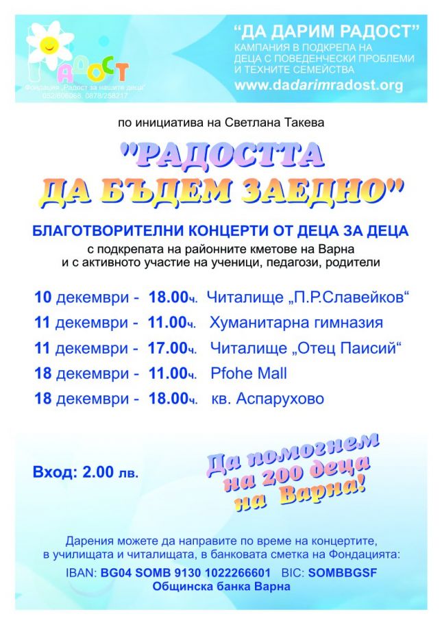 Каним гражданите на Варна – Заповядайте! Дарения за кампанията се правят по време на концертите, както и в урни, разположени в училища и детски градини, хипермаркети, Дворец на културата и спорта и др. Дарения се приемат и чрез банковата сметка на Фондацията – BG04 SOMB 9130 1022266601, BIC: SOMBBGSF, Общинска банка Варна