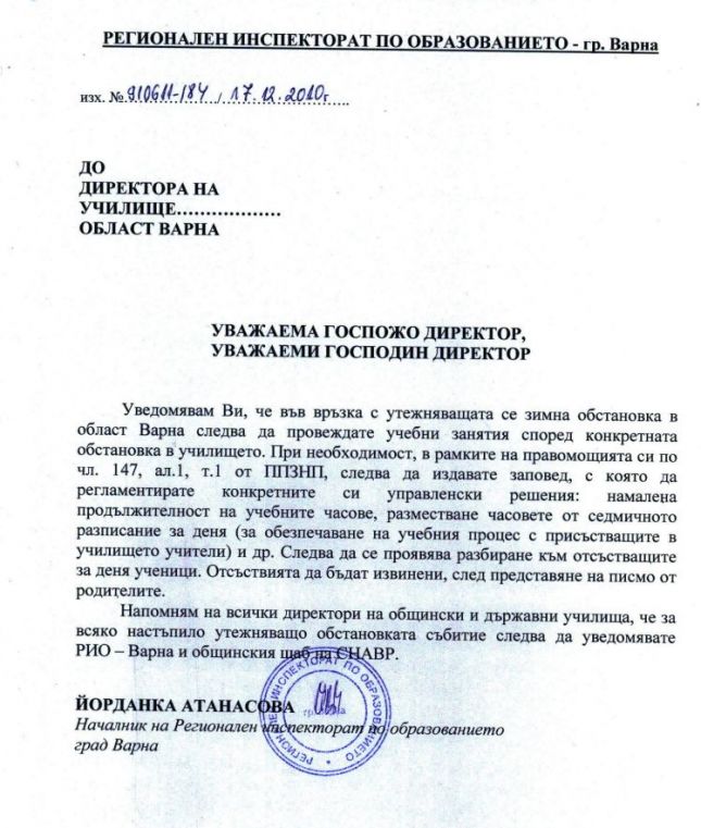 В петък бе изпратено официално писмо, на началник на РИО Варна - Йорданка Атанасова, до директорите на варненските училища. От него става ясно, че всеки директор ще може да прецени дали ще намали продължителността на учебните часове или размести седмичното разписание за деня. Отсъстващите ученици ще могат да бъдат извинени след представяне на писмо от родителите.