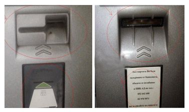 На снимката в ляво - има допълнително монтирано устройство, липсват телефони за контакт с банката. Дясната снимка е на редовен банкомат.