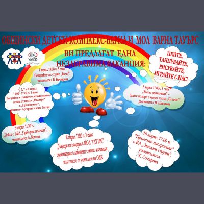 Незабравими мигове с много игри, състезания, театър, танци, музика и забавления ще поднесе на своите гости през април Варна Тауърс. В първите дни на пролетната ваканция центърът ще бъде домакин на серия интересни прояви, подготвени от Общински детски комплекс Варна. Още на 1-ви април в 19.00 часа своя талант ще покажат възпитаниците на танцова студия „Балет”. На 4,5,7 и 8-ми април от 14.00 до 17 .00 часа творчески школи „Палитра” и „Сръчни ръце” канят малки и големи да се включат в работилничка за изкуство, където всички заедно ще рисуват, творят и сгъват оригами. Детски спектакъл „Весела приказчица” ще представят актьорите от куклен театър „Палечко” в увеселителен парк „Двете кули” на 8- ми април от 11.00 часа. Час по-късно ще стартира луда надпревара в лабиринта на Варна Тауърс. „Пролетно настроение” ще внесе вокален ансамбъл „Звездни струни” с концерт на 10 април. Предвидено е проявата да започне в 17.00 часа. Очакват ви още много изненади през следващите дни във Варна Тауърс.