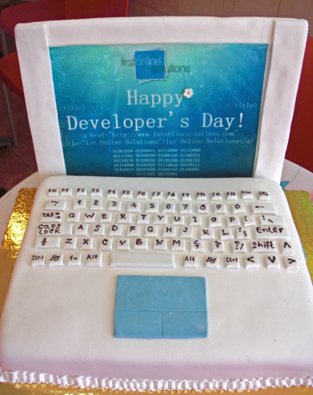 First Online Solutions - Варна отбеляза празника с изненада за своите програмисти – голяма торта във формата на лаптоп с изобразен върху екрана поздрав ‘‘Happy Developer’s Day”, който в духа на празника беше вписан в уеб-код.