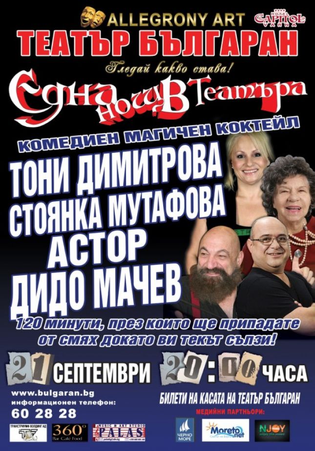 От днес до сряда, театър „Българан” ще проведе промо кампания под надслов „Смях за всички”. На касата на театъра в рамките на три дена ще се предлагат три промо пакета. Всеки който закупи един билет за двама за шоуспектакъла „Една нощ в театъра” с Тони Димитрова, Астор, Стоянка Мутафова и Дидо Мачев ще получи подарък, втори безплатен билет за двама за премиерата на комедията „Халосник” на 26.09 от 20.00 часа. Второто предложение е: при закупен един билет за двама за комедията с Герасим Георгиев – Геро „Между два стола” на 27.09 от 20.00 часа, отново ще получите втори безплатен билет за двама за премиерата на спектакъла на Мариус Куркински „Държавните липи” на 13.10 от 20.00 часа. Третото предложение на театър „Българан” е повече от изкушаващо. За комедията по Чудомир „Село, село, пусто село” в рамките на кампанията билетите ще са с фиксирана цена от 15.00 лв. като към всеки закупен билет ще получите втори безплатен за премиерата на „Две хубави очи” на 14.10 от 20.00 часа. От театър „Българан” също така съобщават, че обявения за днес спектакъл на Нешка Робева „Забравени” няма да се играе по технически причини. Предварително закупените билети следва да бъдат презаверени за друго представление или върнати на касата на театъра в периода 25 – 30 септември. Билетната каса ще работи без прекъсване от 11.00 до 22.00 часа. Телефона за информация е 60 28 28. При организирани посещения билетите се доставят на място.