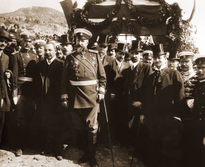 Фердинанд I, министър-председателят Александър Малинов и генерали при обявяването на Независимостта на България