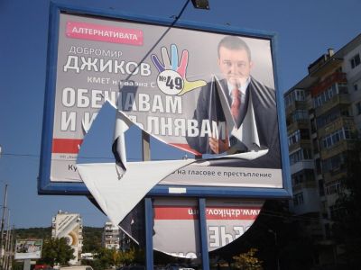 Повечето от билбордовете на кандидата за кмет на Варна Добромир Джиков бяха унищожени тази нощ. Поне 20 от позициите, наети за кампанията на кандидата с № 49, са станали жертва на вандали. Винилът, опънат върху металните конструкции, е целенасочено нарязан от хора, които очевидно са разполагали с план и стълба. Това е най-масовото посегателство срещу предизборни рекламни материали в тази кампания, но далеч не е първото. От няколко дни са празни всички рекламни пана по спирките на бул. „Владислав“ и „Княз Борис I” към „Траката“. Те бяха отворени една нощ и от тях старателно бяха извадени всички рекламни изображения на кандидата за кмет Добромир Джиков. В момента фирмите, стопанисващи тези рекламни съоръжения, подменят ключалките на паната, за да нямат до тях достъп вандали