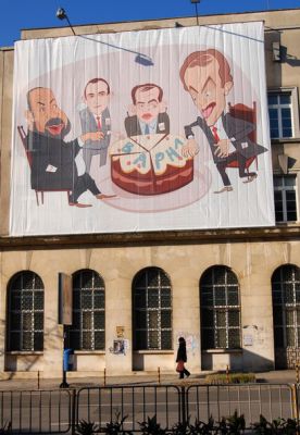 Огромен предизборен шарж е опънат върху сградата на централната поща във Варна. Площта на платното е колкото 5 стандартни билборда.