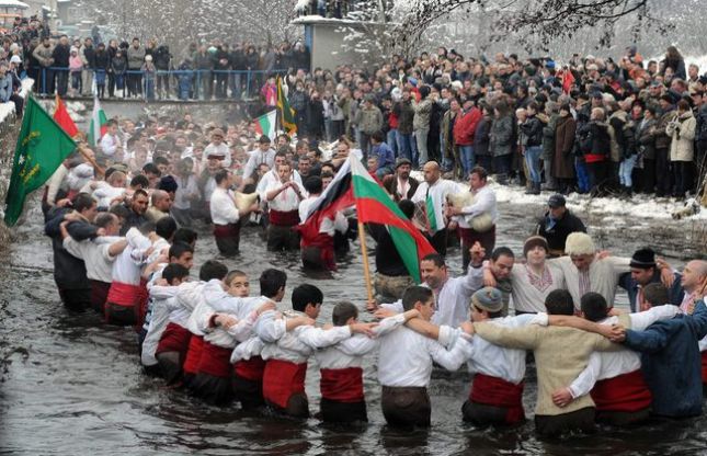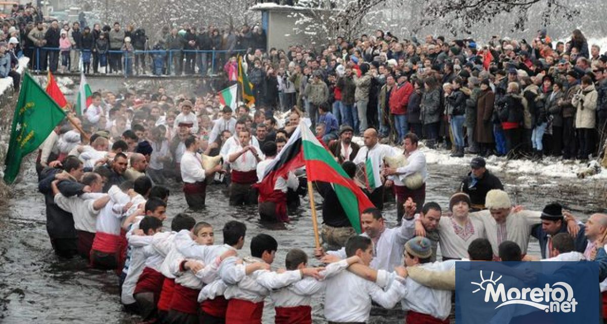 Точно в 8 часа Мъжкото хоро в Калофер, водено от кмета Румен Стоянов, под звуците на три гайди и с най-малкия участник в хорото Иван Беклиев, влезе в студените води на река "Тунджа", предаде репортер на БГНЕС.